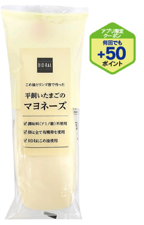 BIO-RALの人気商品「こめ油」と有精卵の平飼いたまご、リンゴ酢を使用したこだわりのマヨネーズ。