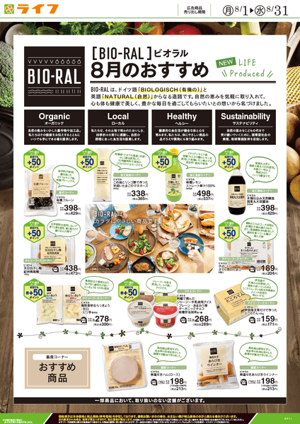 “おいしい” “ワクワク” “ハッピー” をお届けするライフコーポレーションは、健康志向のお客様におすすめしたいBIO-RAL(ビオラル)商品を、毎月お試し価格やポイントプレゼントなどでお得にご提供しております。8月のおすすめは「こめ油とリンゴ酢で作った平飼いたまごのマヨネーズ」「有機レモンストレート果汁100%」「阿蘇で育んだジャージー牛乳使用アイス」などを含む15品です。