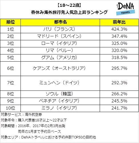 DeNAトラベルが、 「18-22歳の春休み海外旅行先人気急上昇ランキング」 を発表! 燃油サーチャージ0円の影響で遠方が人気に