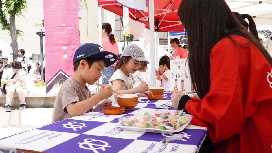栄養学科では「実践力」を培うために、学外での食育活動に積極的に参加しています。今年度は、「楽しく学ぼう!」をコンセプトに、『豆つかみゲーム』『1日に必要な野菜摂取量350gを量ろう』を企画して食育実践活動を行いました。