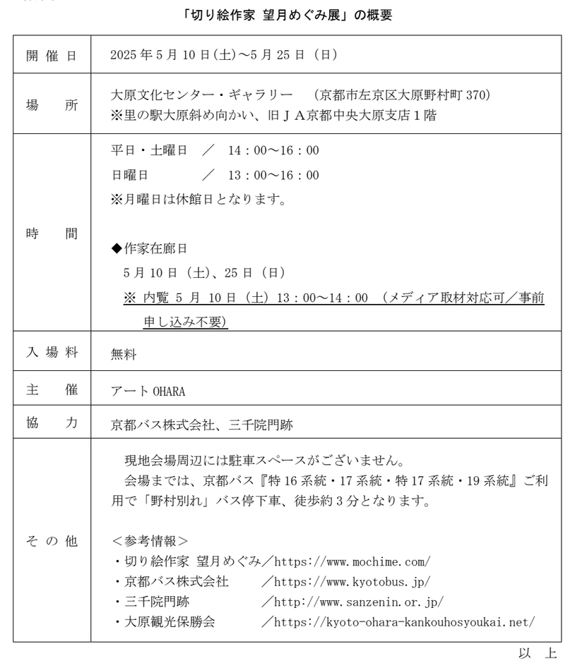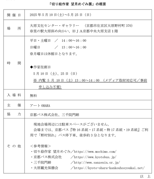 文化交流事業を企画するアートOHARA(所在:京都市左京区、代表:ノブコ・ウエダ)は、京都バス株式会社(本社:京都市右京区、代表取締役社長:吉本直樹)ならびに三千院門跡(所在:京都市左京区、門主:小堀光實)協力のもと、「切り絵作家 望月めぐみ展」を開催いたします。京都バス創業100周年記念「大原女号」、EVバス「オオムラサキ号」などのラッピングバスデザイン原画を2025年5月10日(土)から5月25日(日)までの期間展示します。