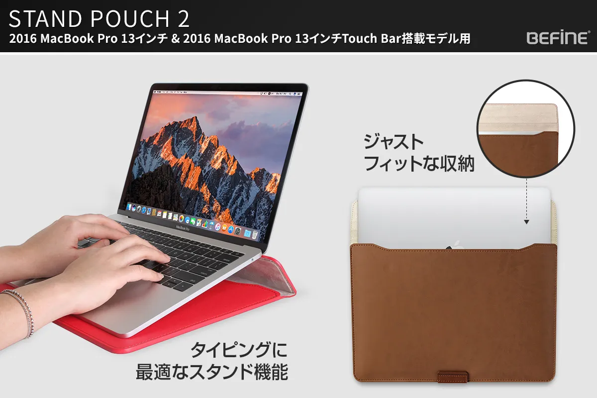 モバイルケース・アクセサリー専門の株式会社ロア・インターナショナル(所在地:東京都新宿区、代表取締役社長:Ally Won)は、BEFiNE(ビファイン)のApple MacBook Pro 13インチ(2016, 13インチモデル&13インチ Touch Bar搭載モデル)専用ポーチ「STAND POUCH 2」の発売を開始しました。本製品は、収納とスタンドの2つの機能を備え、本革をポイントに使用したデザインがお洒落な、よりスマートで便利なMacBookライフを提供するポーチです。