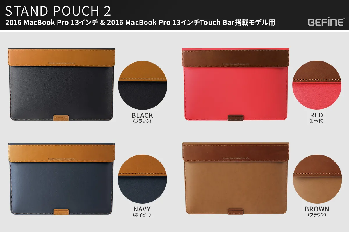 | 商品名 :2016 MacBook Pro 13インチ専用 スタンドポーチ2 商品ページ :http://www.mycaseshop.jp/bf10033 バリエーション :ブラック、レッド、ネイビー、ブラウン 対応機種 :2016 MacBook Pro 13インチ 2016 MacBook Pro 13インチ Touch Bar搭載モデル 素材 :合成皮革、牛革 価格 :5,500円(税抜) |