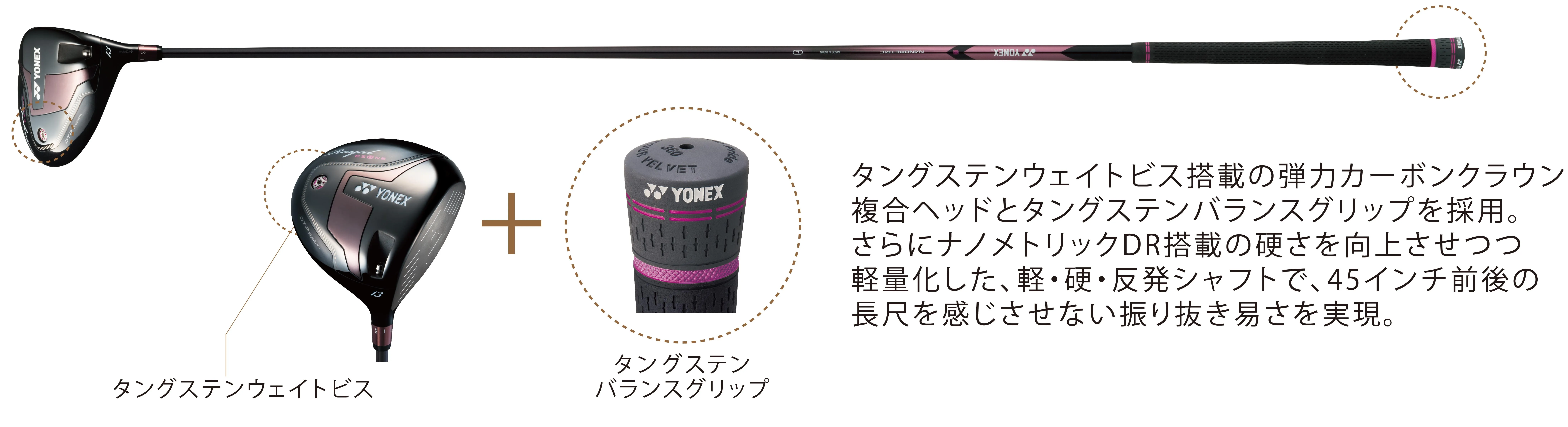 ドライバーヘッドのクラウンにはナノテクノロジーの新素材“タフGファイバー”を採用し、新製法「真空内圧成形」による緊密なカーボン成形により薄肉かつ反発性が向上した弾力カーボンクラウン複合ヘッドとし、ボールを上げやすい設計と致しました。またヘッドとグリップにタングステンを搭載し、長尺でも軽く振り抜ける「DTP(デュアルタングステンパワー)システム」を採用。さらに振り抜きやすさを追求し、シャフトは世界最軽量のXELAシャフトのノウハウを活かし開発した最軽量35gの専用シャフトを開発しております。このようにヘッド・シャフト・デザイン共に女性ゴルファーにとって最適な専用設計としたシリーズが誕生致しました。