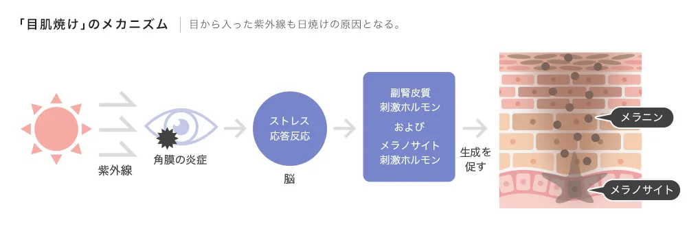そのメカニズムは、目から入った紫外線によって発生した角膜炎症が副腎皮質刺激ホルモンとメラノサイト 刺激ホルモンを生成し、それらのホルモンが血中に流れることによって、メラニン産生細胞であるメラノ サイトを刺激し、直接紫外線が当たっていない肌にもメラニンが生成されるというものです。