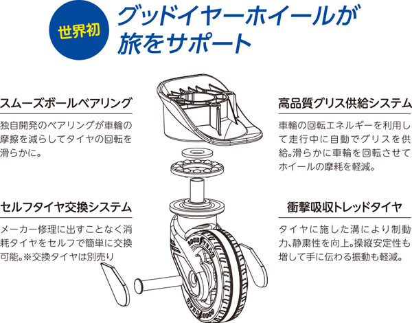 GOODYEARホイールは独自開発のテクノロジーにより車軸にかかる負担を軽減させる設計になっており、車輪の回転をスムーズにして滑らかな走行を実現しました。