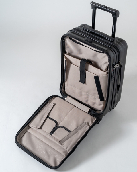 「Regent Square」は機内持ち込み対応のファスナータイプのスーツケースです。フロントポケット付きのスーツケースは便利ですが従来品には課題もありました。それはスーツケースを開いた際の左側のスペースをポケットとして使用しているため、ポケットの容量の分だけケース内部の収納スペースが減る設計になっていました。