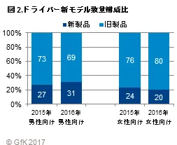 クラブ販売金額の3割を占めるドライバーは、全体では金額前年比1%減であったが、男性向けでは同1%増となった。ドライバーにおける新製品(2016年発売モデル)の販売数量構成比は、男性向けでは31%と、女性向けより約1割高かった(図2)。男性ゴルファーによる新製品への買い替え需要が市場を下支えしているといえる。