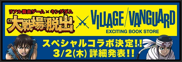 リアル脱出ゲームを手がける株式会社SCRAP(本社:東京都渋谷区 代表:加藤隆生)は、大人気アニメ作品『キングダム』(原作:原泰久/集英社発行「週刊ヤングジャンプ」連載中)とコラボレーションしたリアル脱出ゲーム、「ある大戦場からの脱出」の開催に伴い、オリジナルグッズの発売、ヴィレッジヴァンガードとのコラボレーションを決定いたしました。