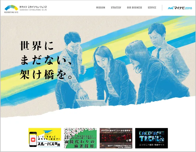 3月の大手ナビサイトオープンに先立ち、カケハシ スカイソリューションズでは2018年度新卒採用特設ページを開設いたしました。ご応募を検討いただく学生さんにお伝えしたい弊社のミッションや特徴ある事業、具体的なサービス導入事例などをご紹介しています。