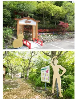 官兵衛古道では日本温泉保養士協会の監修を受けた森林浴ヨーガのサインを古道内に3箇所設置。動きとともに呼吸を合わせるヨーガによって、効果的にフィトンチッドを体内に吸引していただけるよう工夫しています。ヨーガポーズは春(4月~6月)、夏(7月~9月)、秋(10月~11月)季節ごとに替えてご案内いたします。