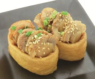 青森で獲れた新鮮なほたてを佃煮にし、いなり寿司の上にトッピングしました。甘辛いタレがよく染みこんだほたてとおいなりさんがよく合います。