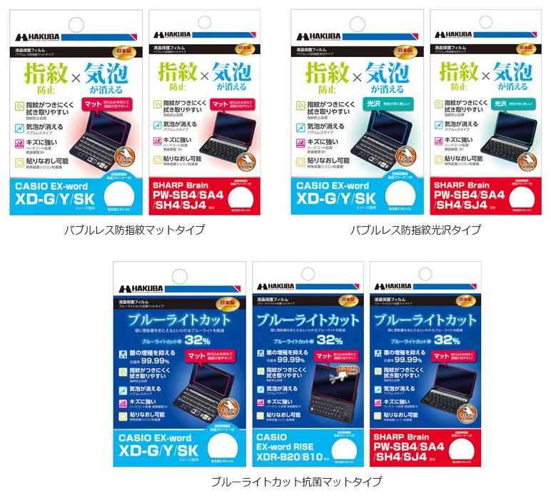 ハクバ写真産業株式会社 (本社:東京都墨田区)は、電子辞書用液晶保護フィルムに「バブルレス防指紋マットタイプ」「バブルレス防指紋光沢タイプ」「ブルーライトカット抗菌マットタイプ」の3タイプ7製品を追加いたします。