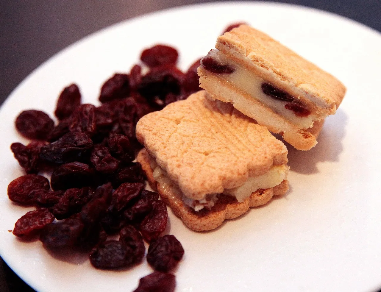 小麦胚芽の栄養に加え、全粒粉を使用した素材本来の栄養、味わいが楽しめる「ジェルブレ 全粒粉ビスケット」に濃厚クリームとほんのりラムが利いたレーズンを挟みました。