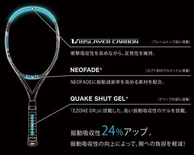振動吸収性を高めながら反発性を維持する、カーボンに衝撃吸収材を層状に複合した「バイブスレイヤーカーボン」をフレームトップ部に搭載。さらに、構造体の共振を抑え、振動を効率良く減衰させる「ネオフェード+」、振動吸収性ゲルと3つの素材で、衝撃吸収性24%※向上。腕への負担を軽減し、楽にボールが打て、長時間プレーを楽しめます。
