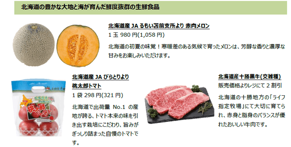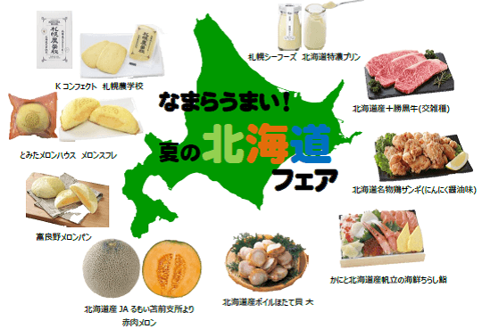 新型コロナウイルス感染拡大の影響が長期化し、内食や中食の需要が高まっています。当社では、遠出ができない中、少しでもご自宅で旅行気分をお楽しみいただくため、銘産フェアやご当地フェアを実施しており、大変ご好評をいただいております。今回は夏の北海道フェアとして、北海道各地の銘産品や豊かな大地と海が育んだ生鮮食品、自慢のスイーツや素材の鮮度とおいしさを活かした惣菜を販売いたします。