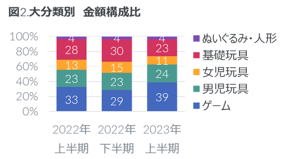 大分類別にみると、2022年に引き続きトレーディングカードの販売が伸びた「ゲーム」の金額は34%増と、今期も純玩具全体の金額拡大をけん引した。大分類ゲームが玩具全体に占める金額構成比は、前年同期から6%ポイント拡大し約4割に達した(図2)。「ぬいぐるみ・人形」は、純玩具に占める構成比は4%と小さいながらも、「ポケットモンスター」や「ちいかわ」のアイテムが好調に販売を伸ばしたことなどにより、金額が21%増となった。「男児玩具」は、上半期としては2019年以来4年ぶりのプラス成長となった。「仮面ライダーシリーズ」や「ウルトラマン」などの男児キャラクター関連では、テレビ連動商品やソフビ人形の販売が好調に推移した。ガンダムや仮面ライダーとのコラボレーションが話題となった「トミカ」や映画コンテンツとのコラボレーション商品を多く展開する「ホットウィール」などが含まれる「ミニカー」は、金額前年比が23%増となるなど、男児玩具の金額拡大を後押しした。