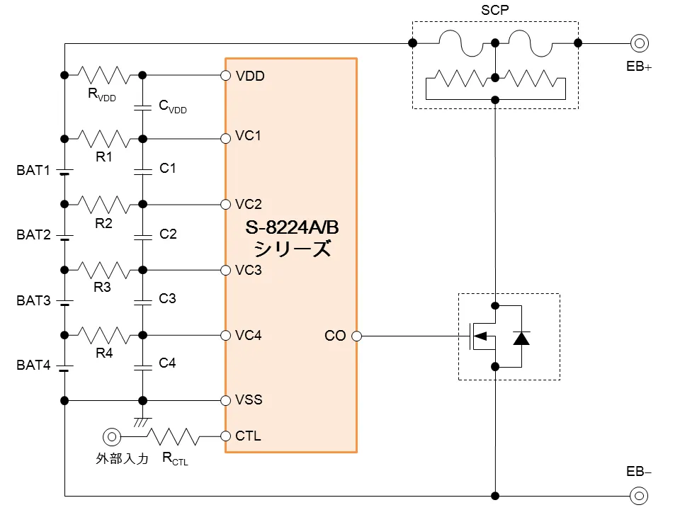 また、出力制御機能によりPTCを用いた温度保護機能を付加することができるため、過充電だけでなく、異常温度も検出することが可能です。さらに「S-8224Bシリーズ」は充電制御用FETのゲート接続端子に出力電圧制御回路を備えているため、ゲートソース間耐圧が12VのFETも使用可能です。