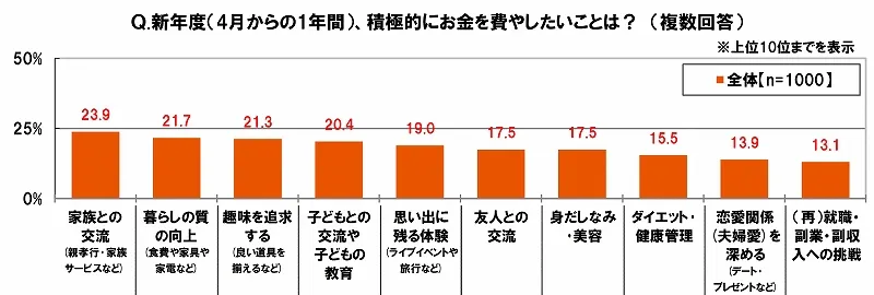 全回答者(1,000名)に、これから始まる新年度(4月からの1年間)、積極的にお金を費やしたいことを聞いたところ、「家族との交流(親孝行・家族サービスなど)」が23.9%で最も多く、次いで「暮らしの質の向上(食費や家具や家電など)」が21.7%、「趣味を追求する(良い道具を揃えるなど)」が21.3%、「子どもとの交流や子どもの教育」が20.4%、「思い出に残る体験(ライブイベントや旅行など)」が19.0%で続きました。