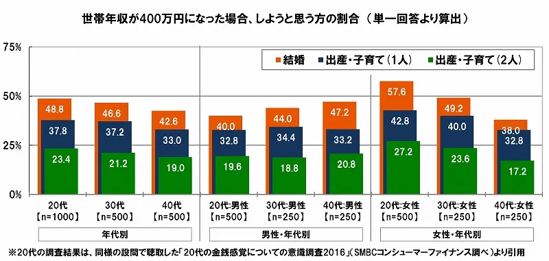 では、これらのライフイベントに対する姿勢は、年代によって傾向に違いはみられるのでしょうか。1世帯当たりの所得金額の中央値は427万円と発表(※3)されているため、これを“一般的な世帯年収の目安”として、年収400万円で結婚や出産・子育てに前向きになれる割合を確認していくことにします。