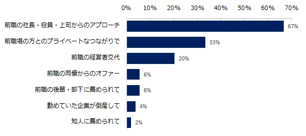 出戻り入社を経験したことがある方にきっかけを伺うと、もっとも多い回答は「前職の社長・役員・上司からアプローチがあったから」(67%)でした。役職が高い方からの声掛けが、出戻りに繋がっているケースが多いようです。