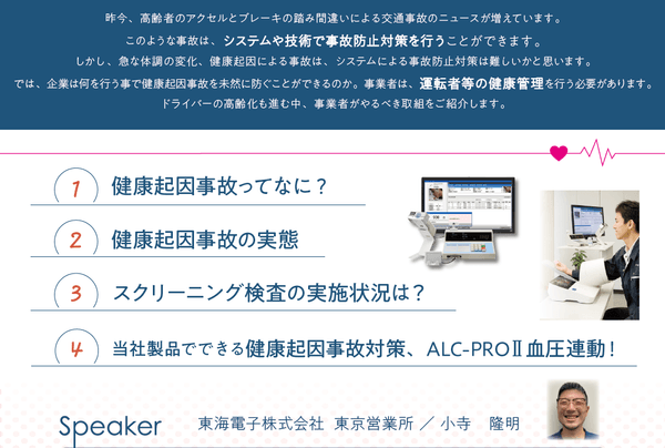 飲酒運転防止のためのアルコール検知器及びIT点呼システムを開発・販売する東海電子株式会社(本社:静岡県富士市 代表取締役:杉本 哲也)は、 この度、 「事業者がやるべき取組とは!?健康起因事故の実態とALC-PRO2血圧連動を活用した事故対策 」ウェビナーを5月31日(水)に無料開催いたします。