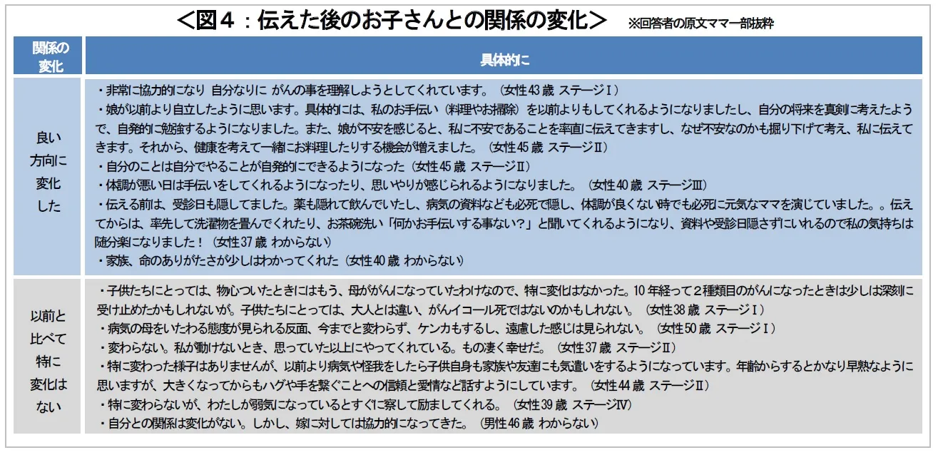 ・伝えた後にお子さんとの関係が「良い方向に変化した」と回答した方は、家事などのお手伝いを自発的に行うようになる、思いやりを感じるなどの変化を挙げている。親の状況をそれぞれの立場、状況で理解し、自発的に行動する、自立することが、お子さんの変化として生まれる傾向が見られた <図4>