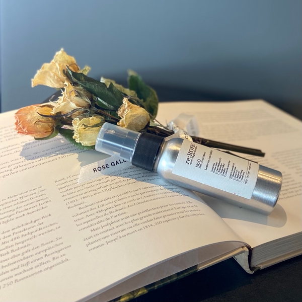 ローズギャラリーの契約農家さんが栽培する香り高いバラのうち規格外として廃棄されてしまうバラを買い取り濃厚な香りのローズウォーターを蒸留して贅沢に配合した香りのアイテム。