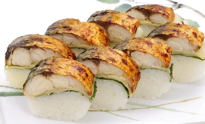肉厚で脂がのった鯖をこんがりと焼き、福井県産コシヒカリのシャリで大葉と
