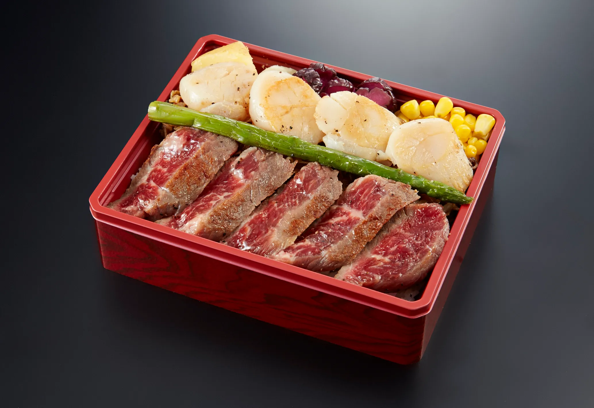 北海道産の十勝若牛のステーキと、北海道で獲れた帆立貝柱をジューシーに