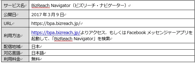 株式会社ビズリーチ(所在地:東京都渋谷区/代表取締役社長:南 壮一郎)が運営する、即戦力人材と企業をつなぐ転職サイト「ビズリーチ」は、チャットボットがビズリーチ上にある求人を探してくれる「BizReach Navigator」(以下、ビズリーチ・ナビゲーター)(https://bpa.bizreach.jp/)を、3月9日にFacebookメッセンジャーで正式リリースします。