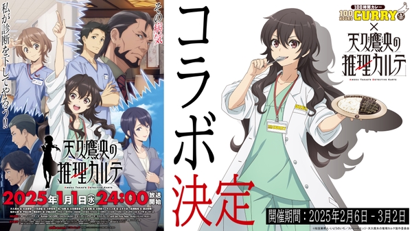 全国約50店舗展開のカレー専門店「100時間カレー」を運営する株式会社アークス(本社:東京都豊島区、代表取締役:米田周平)は、2025年2月6日(木)からTVアニメ『天久鷹央の推理カルテ』とのコラボキャンペーンを全国の100時間カレー店舗および通販サイトで実施することをお知らせします。