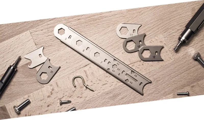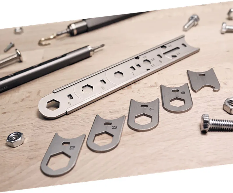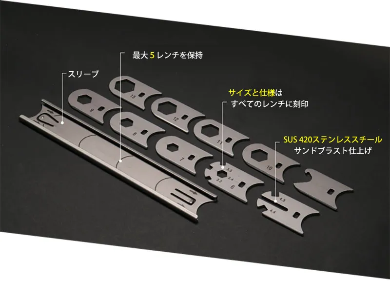 WRENCHitは最大5つのレンチをセットでき、全部で15以上の機能を持ち合わせます。スリーブはサンドブラスト仕上げのハイグレード「SUS 420ステンレススチール」で作られており、すべてのレンチもSUS420を使用しています。