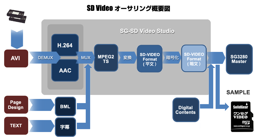 Chroma SG3280用マスターデータ制作用にワンセグビデオ用オーサリングツール、SG SD Video Studioを開発いたしました。このツールにより非圧縮AVIファイルの映像データをSD Videoフォーマットに変換、および暗号化が行えます(参照: http://www.atpress.ne.jp/releases/12417/3_3.jpg )。ワンセグ放送でサポートされている文字データ(BML)や字幕も対応しています。このツールでサポートされるSD Videoフォーマットは、現在市場にあります160機種以上で互換性が確認されています。出力フォーマットは、Chroma SG3280のマスターデータの形式で出力され、ワンセグビデオカードの量産にそのまま使用できます。