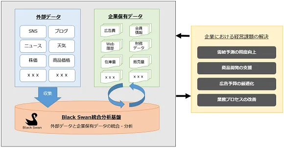 Black Swan社は、SNSや天気、ニュースなどの外部データと、企業が保有する販売や在庫実績、会員情報などの内部データを、統合的かつ柔軟に分析できる独自開発の基盤を活用し、ビッグデータ分析サービスを提供しています。シンプルでデザイン性があるBlack Swan社の統合分析基盤は汎用性が高く、欧米では各分野のグローバル企業に採用されており、主に需給予測の精度向上、商品開発の支援、広告予算の最適化、業務プロセスの改善を支えています。