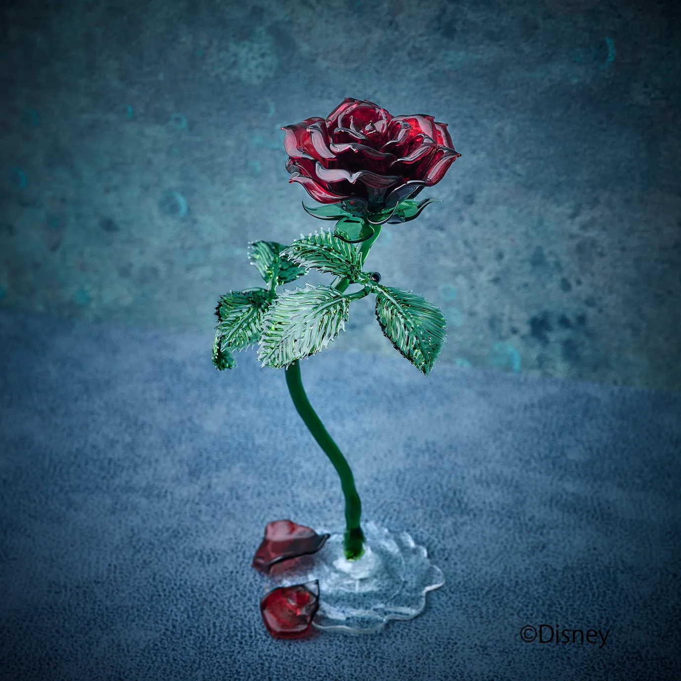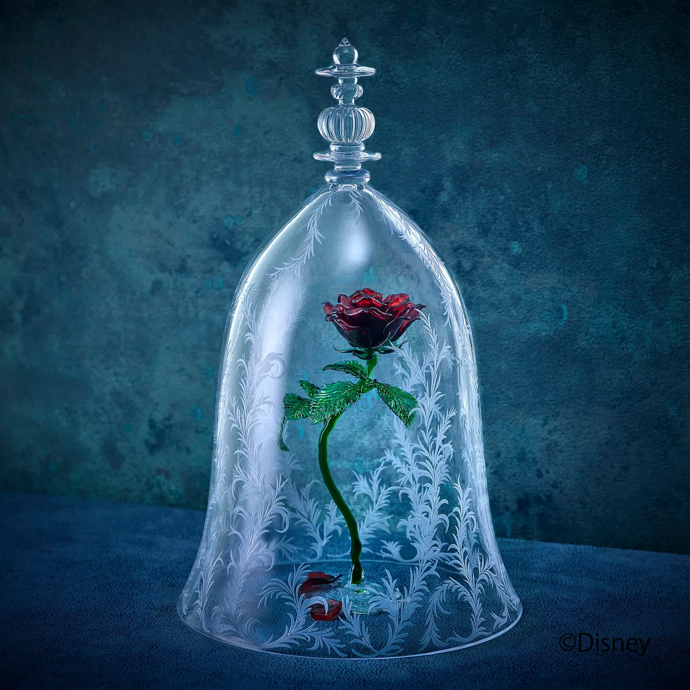 「la rose」は、映画に登場する「魔法のバラ」のデザインを忠実にガラスで再現したオリジナルのフラワーオブジェです。ガラス製のドーム、リーフ模様のカッティングデザイン、まるで魔法で浮いているように、映画のイメージを残しつつ、「自然な植物の表情や花色」に近づけたガラス製のバラなど、細部にこわだわってデザインしています。