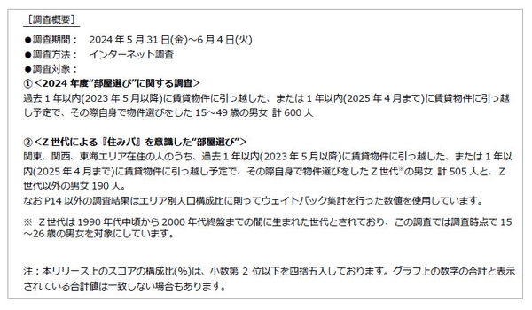 関東、関西、東海エリアに在住の人のうち、1年以内(2023年5月以降)に、自身で部屋選びをして「賃貸物件」に引っ越しをした、または今後1年以内(2025年4月まで)に引っ越す予定の、Z世代の男女505人と27~49歳の男女190人を対象に、部屋選び・家具家電選びの際に意識することに関する調査を行いました。