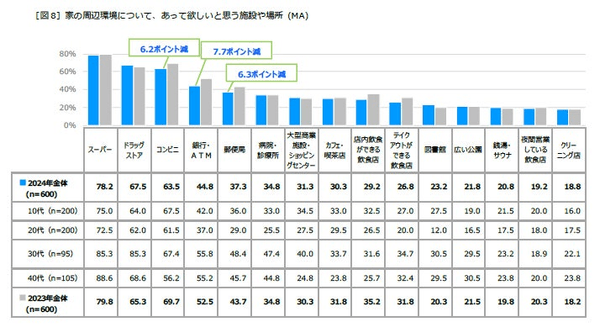 家の周辺環境について、あって欲しいと思う施設や場所を聞くと、1位は昨年同様「スーパー」(78.2%)となり、日常的な買い物に欠かせない存在であることが分かります。2位と3位は昨年度と順位が入れ替わり、2位「ドラッグストア」(67.5%)、3位「コンビニ」(63.5%)となりました。コロナ禍の食品購入拡大などを受け品ぞろえが多様化しスーパー化したドラッグストアが、人気を高めています。特に30代でのドラッグストア重視率が高く、「スーパー」と同率1位となる85.3%が回答しており、利便性を感じている人が多いようです。