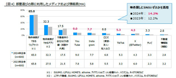 「YouTube」「Instagram」「TikTok」がそれぞれ昨年より利用率が微増する中、「X(旧Twitter)」は微減しています。「SNSいずれか」を利用している人を見ると、2024年度全体では14.2%で、昨年度(12.2%)より2.0ポイント増加しています。こちらも今後物件探しにおける定番ツールとなりそうです[図4]。