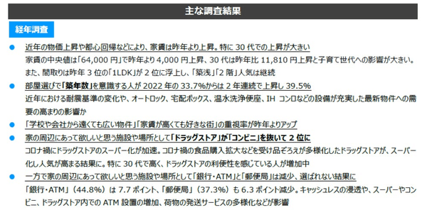 一方「築年数」(39.5%)は昨年からは1.7ポイント微増し、2022年の33.7%から2年連続で上昇しています。近年耐震基準が変化していたり、最新物件にオートロック、宅配ボックス、温水洗浄便座、IHコンロなどの設備が充実してきたりしている背景から、築浅物件の需要がより高まっているといえそうです。