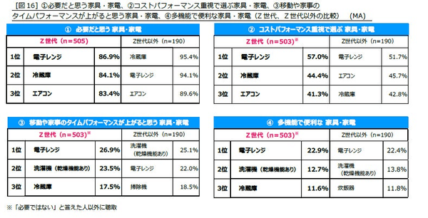 ②「コスパで選ぶ家具・家電」でもトップ3項目は同様となり、必要なものをしっかりとコスパを見極めて購入している様子がうかがえます。③「移動や家事のタイパが上がると思う家具・家電」④「多機能で便利な家具・家電」では、「電子レンジ」「洗濯機(乾燥機能あり)」「冷蔵庫」がトップ3となりました。Z世代以外では、タイパが上がる家電の1位は「洗濯機(乾燥機能あり)」で、洗濯における時短や手間の短縮がより支持されているようです。