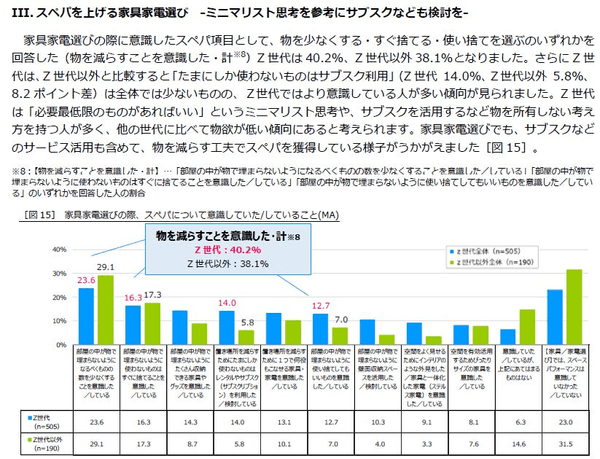 2)Z世代の「部屋選び・家具家電選び」調査からは、かけた費用に対する効果など、「お金・時間・空間」の効率を追求する意識が特に高く、若者の部屋探しの3大要素は「コスパ」「タイパ」「スペパ」と言い切れる結果となりました。特に、コスパへの意識は92.5%と顕著で、好きなものにお金や時間を惜しみなく投資する一方で、無駄なものにコストをかけることは回避したい思いが他世代より強く、「失敗したくない意識」の表れだと推測しています。