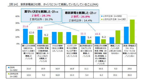 家具家電選びの際に意識したコスパ項目として、1店舗で購入・ブランドを絞って選ぶのいずれかを回答した(選択肢を絞って素早い決定を意識した・計※6)Z世代は28.3%、Z世代以外は16.3%となり大きく差がつきました。また、料理時間・家事時間を減らせるのいずれかを回答した(最新家電を意識した・計※7)Z世代は26.8%、Z世代以外は14.4%でした。Z世代は、Z世代以外に比べて「選択肢を絞った素早い決定」や「最新家電の活用」をかなり意識していることが明らかになりました。選択肢も多く、インターネット上でさまざまな情報があふれている中で、「選ぶ時間」も無駄と感じるZ世代は実店舗を利用したり、信頼できるブランドに絞って選択を行ったりすることでタイパを稼いでいると考えられます[図14]。