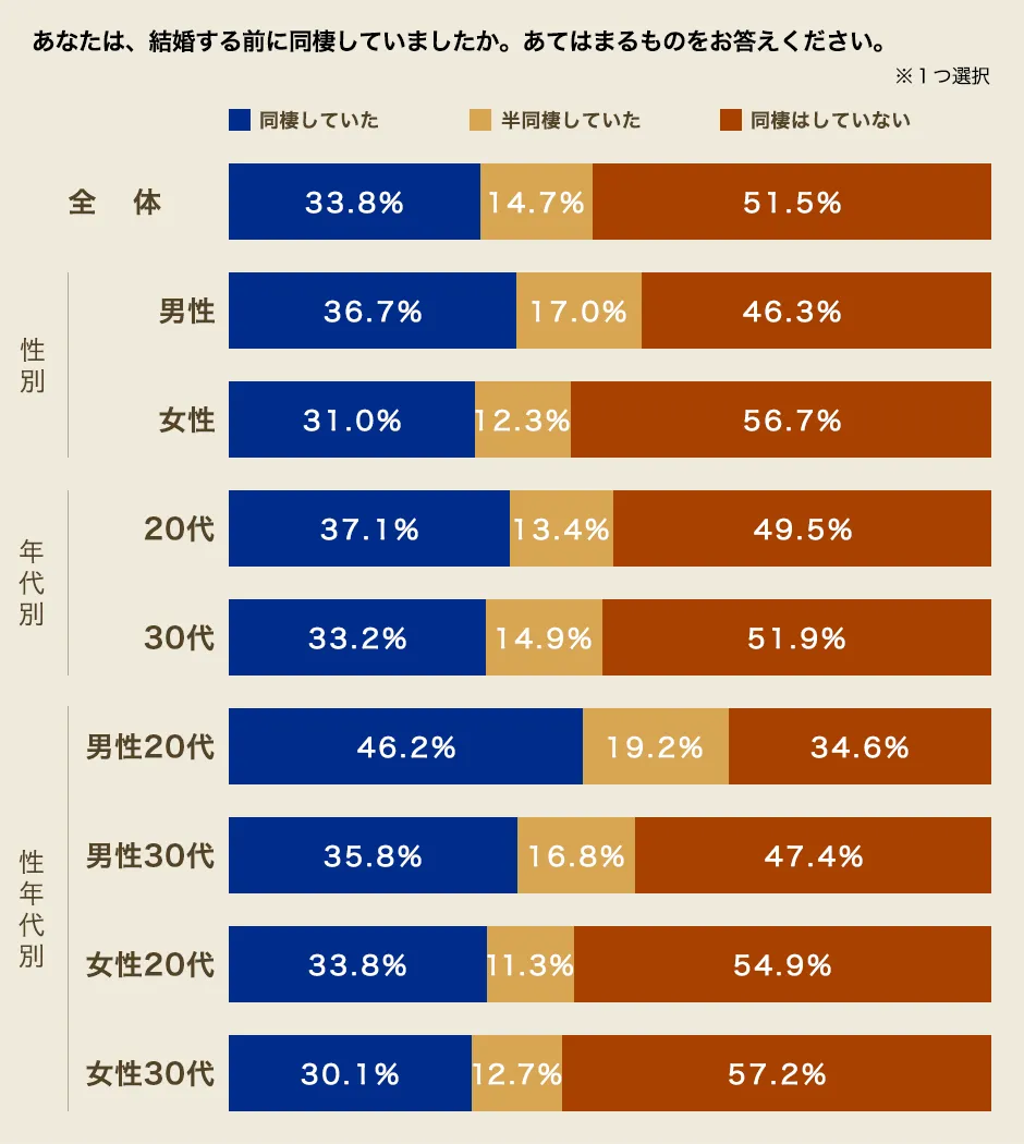 全体では「同棲していた:33.8%」、「半同棲していた:14.7%」、「同棲はしていない:51.5%」という結果になりました。「同棲していた」と「半同棲していた」を合わせると48.5%となり、半数近くの方に同棲経験があることがわかります。性別・年代別で見ると、男性が女性より、20代が30代より同棲経験の割合が高いこともわかります。特に20代男性の割合は突出していて、「同棲していた:46.2%」と「半同棲していた:19.2%」の合計は65.4%となり、若い世代の方ほど、同棲に積極的な傾向が伺えます。