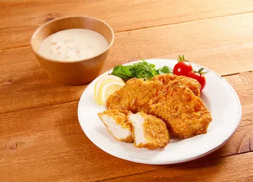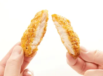 ●原材料:鶏肉(国産)、食塩、ホワイトペッパー、衣(小麦粉、コーンフレーク、牛乳、ばれいしょでん粉、パン粉、チキンスープ、鶏卵、食塩、ガーリックパウダー、ブラックペッパー、パプリカパウダー、ホワイトペッパー、バジル、オレガノ、カレー粉)/重曹、揚げ油(なたね油)(一部に鶏肉・小麦・乳成分・卵を含む)