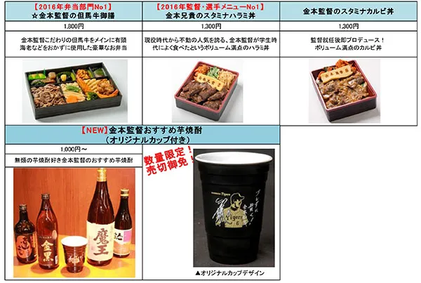 阪神甲子園球場では、2017年シーズン甲子園開幕戦となる4月7日(金)から、シーズン終了(クライマックスシリーズ、日本シリーズ、ファン感謝デーも含む)まで、阪神タイガーズの金本監督及び16名の選手がプロデュースするコラボメニューを販売します。
