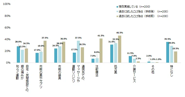 人工膝関節置換術を受けた患者の35.5%は、現在実施している治療や介助・対策は「特になし」と答えた。一方、人工膝関節置換術を受けていない患者は84.7%が何らかの治療や介助・対策を行っていた。