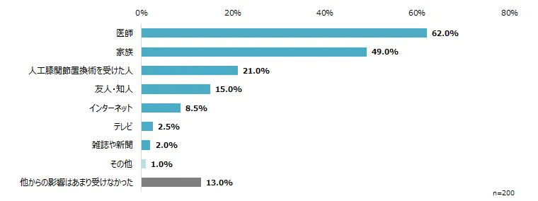 人工膝関節置換術を受けた患者が影響を受けた人は、62.0%が「医師」、次いで「家族」(49.0%)が多かった。人工膝関節置換術を受けていない患者は、「他からの影響を受けない」と答えた患者が26.5%と、人工膝関節置換術を受けた患者の13.0%に比べて多かった。