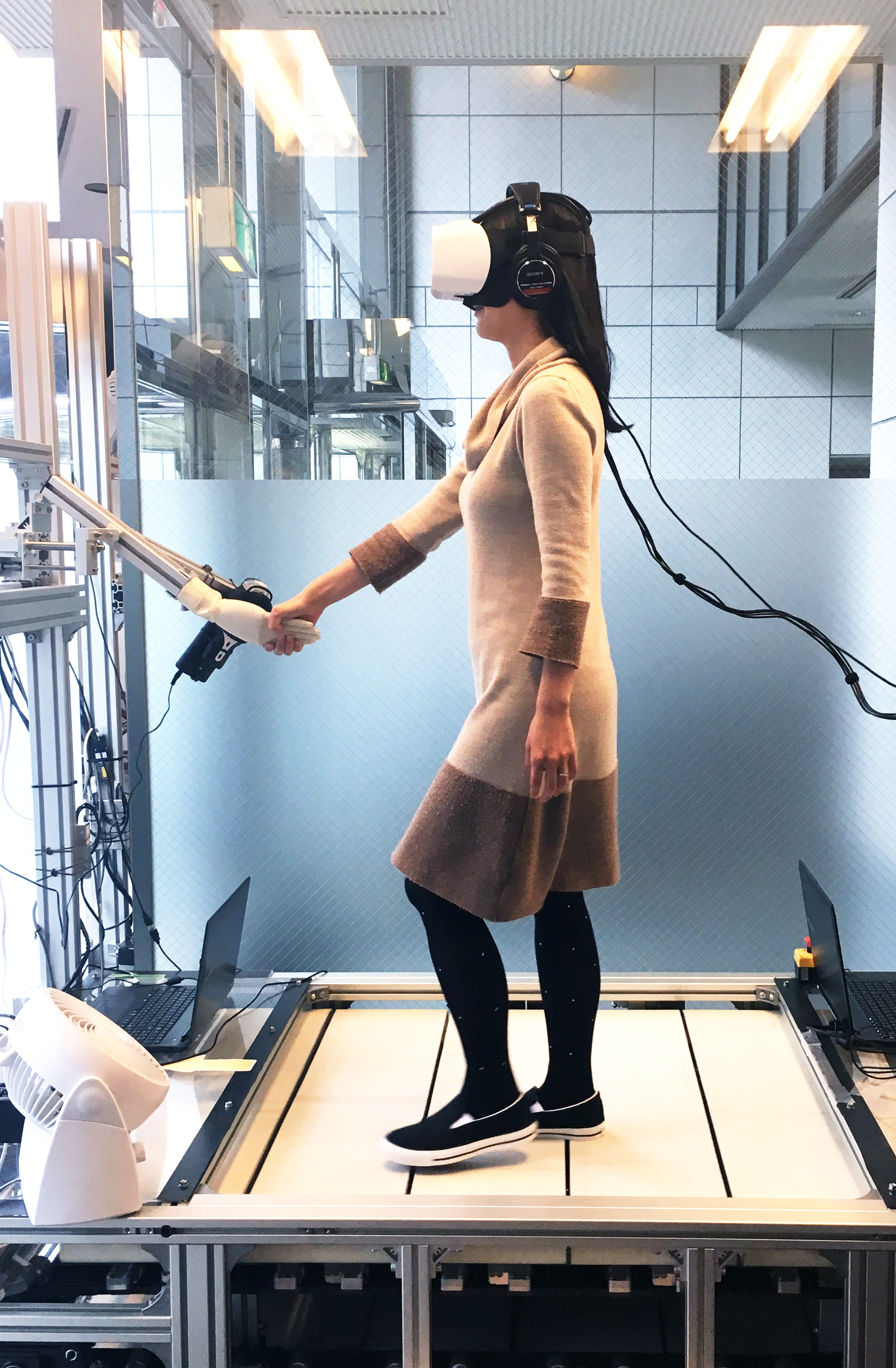 VRの歩行装置はいくつか発表されていますが、より自然に足を運ぶ歩行体験にするため、筑波大学システム情報系 岩田 洋夫教授から歩行装置「トーラストレッドミルmini」※の貸与を受け、本コンテンツの開発に活用しました。「手」(誘導アクチュエータ)を握ることで安定して歩行ができるようになり、「ハーネスも安全柵も不要のVR歩行装置」を実現しました。「誘導アクチュエータ、体感装置、歩行装置を組み合わせて映像にシンクロさせるVR体験システム」は、日本初となります(特許出願中)。