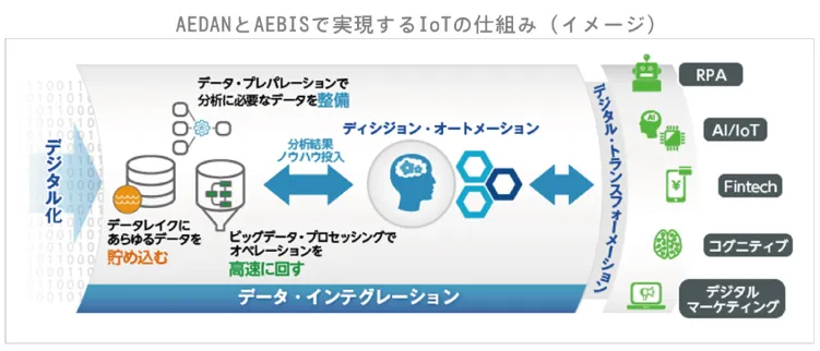 例えばIoTの分野では、自動収集した形式の異なる様々なデータを一箇所に集めるだけではなく、それらのデータを分析し、知見を導き出し、ビジネスや社会に活用していくことが重要です。AEDANであれば、アシストの提供する情報活用ソリューションAEBIS(*2)と組み合わせることでIoTから収集したデータを貯め込み、整備/分析し、意思決定に役立てることが可能になります。